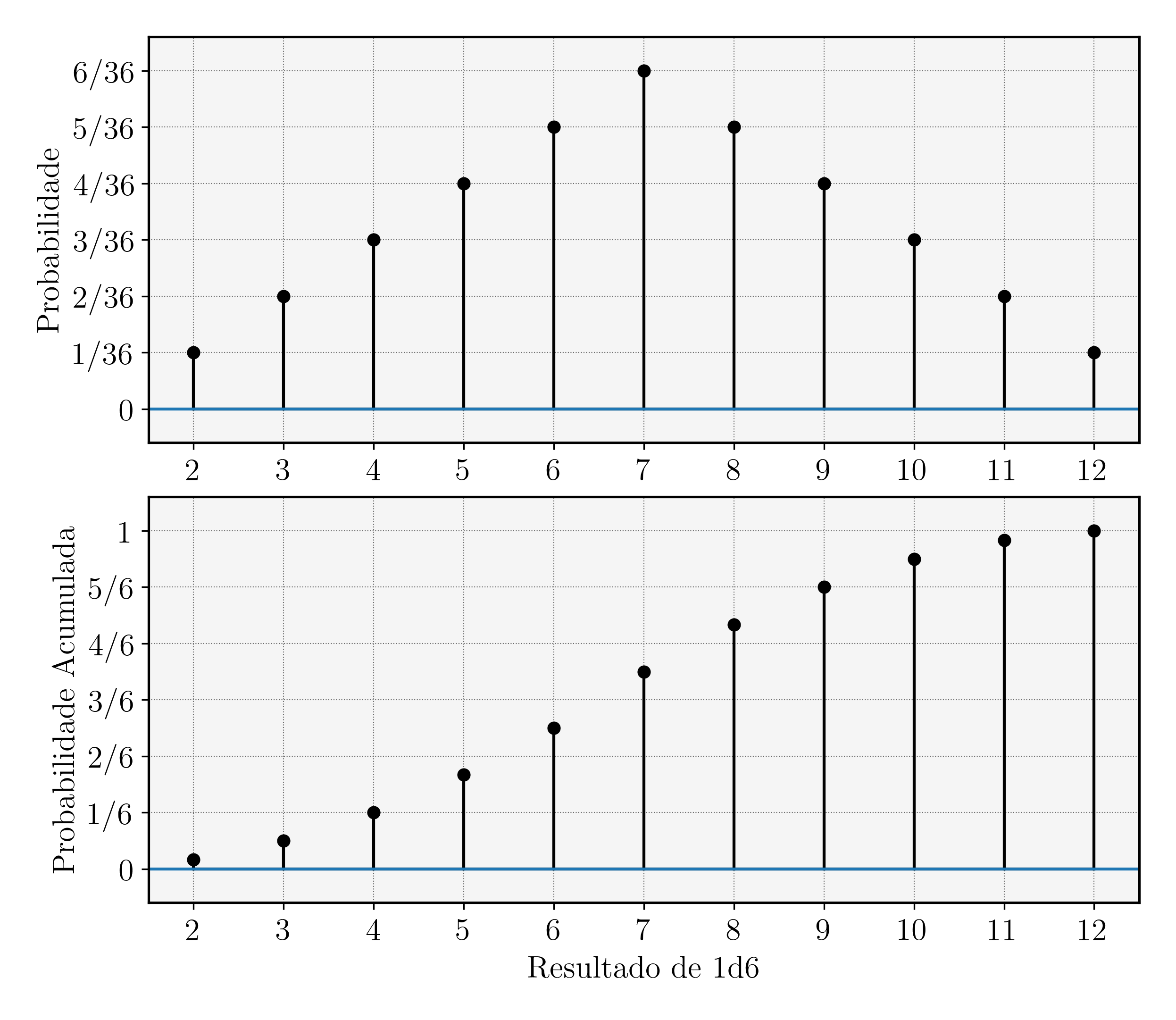 Para analisar, vamos imaginar um sistema em que um teste bem-sucedido aconteça quando o resultado dos dados for menor ou igual ao valor da Habilidade testada. Dá pra ver que podemos ter onze opções de níveis de Habilidades, que vão desde 2 a 12 – o que pode ser interessante, se você quer um pouco mais de detalhes.